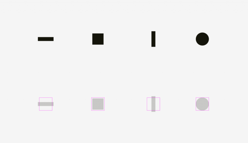 - Кола, ромби, трикутники і інші не квадратні фігури повинні мати більшу висоту і ширину, щоб бути оптично збалансованими з квадратними фігурами.
