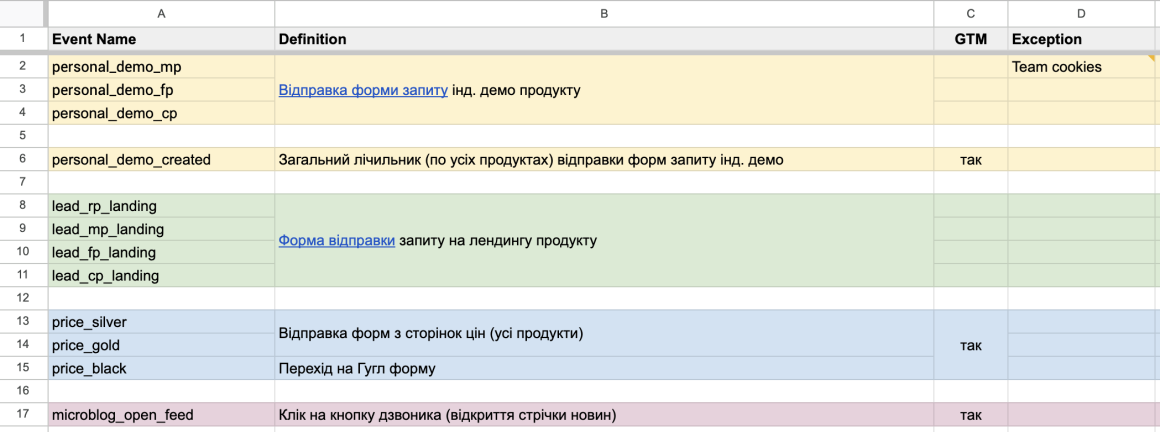 GTM тут означає, що дана подія передається в аналітику через Google Tag Manager. Таким чином, можна одразу зрозуміти, де її налаштовувати.
