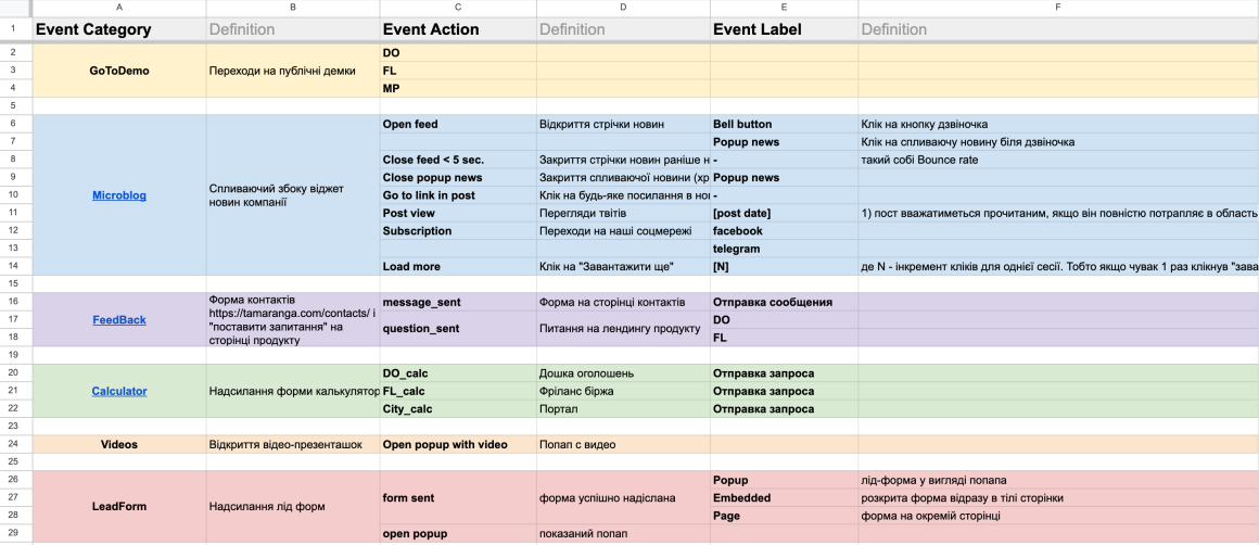 Це події з Universal Google Analytics. З описом назви, категорії і того, що ця подія означає (якщо це неочевидно з її назви).