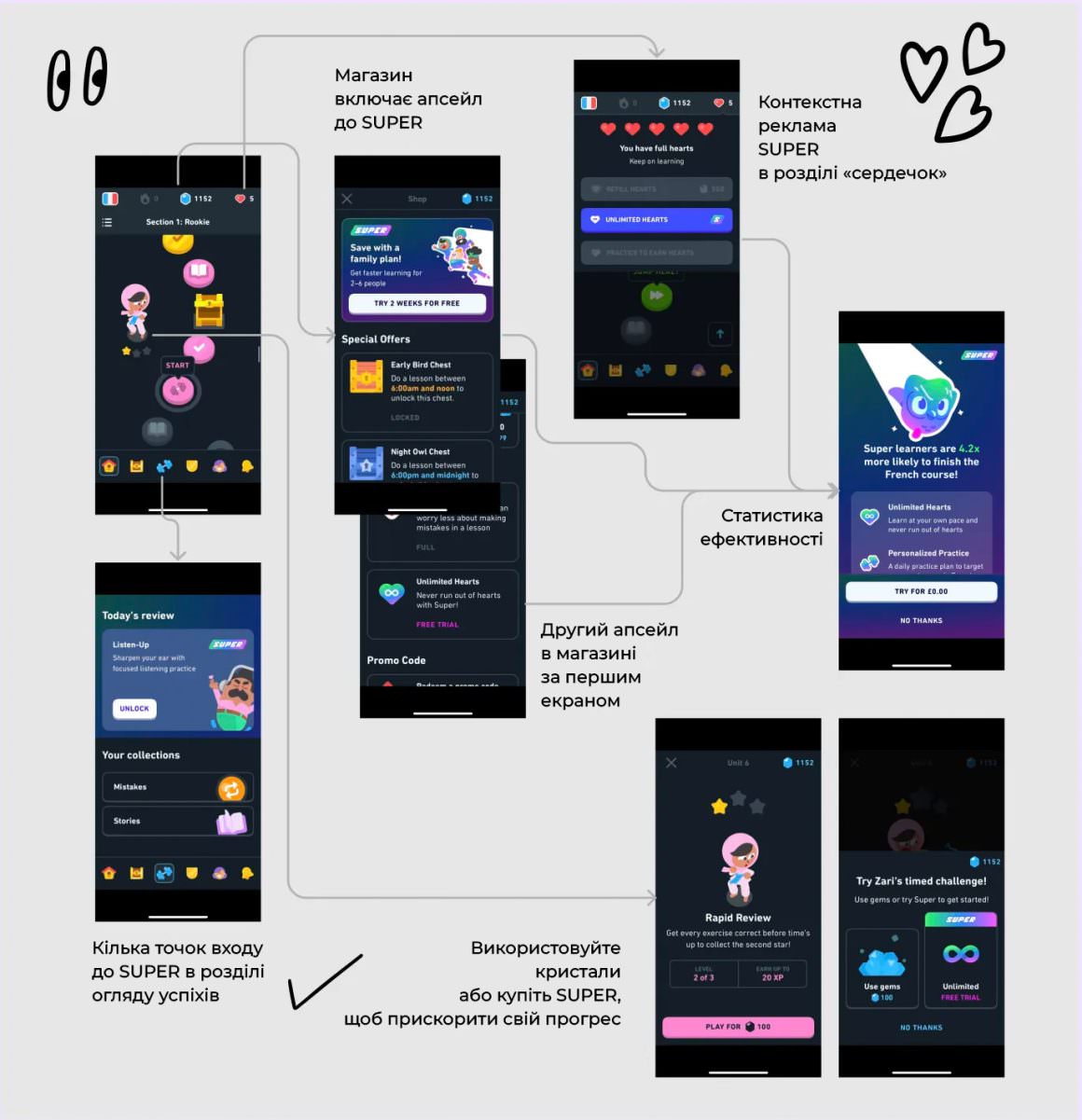 Ми розглянемо 5 інсайтів щодо монетизації і побачимо, як Duolingo спонукає користувачів платити за допомогою UX-потоків, повторних пробних користувань, декількох точок входу і спираючись на психологію учня з Теорії Самовизначення.