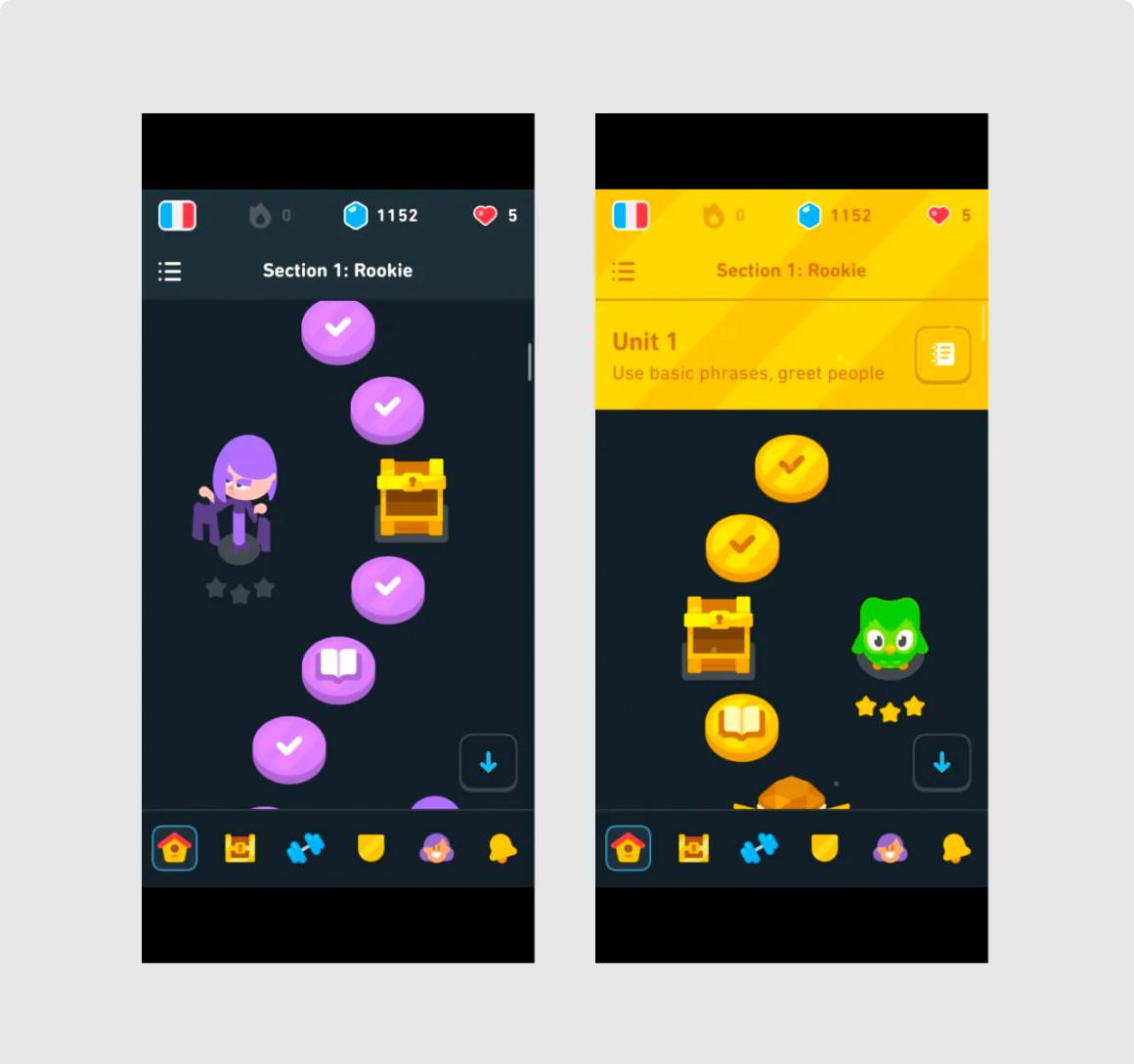 Домашній екран Duolingo працює не лише як огляд курсу, але й як to-do список з галочками. Важливо, що є два «повних» режими: