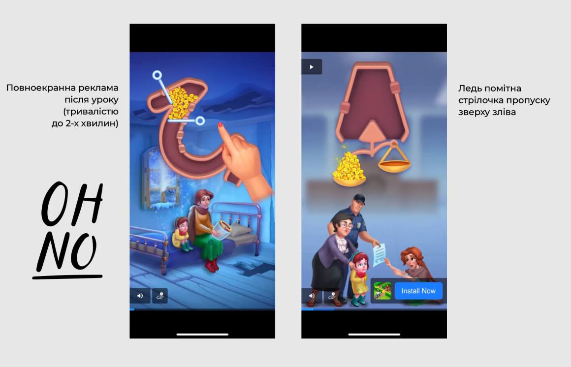 Реклама починається без можливості виходу з неї, потім вгорі ліворуч з’являється ледь помітна іконка «play». Підступний, як і слід було очікувати, хрестик у верхньому правому куті, що відповідає ментальній моделі виходу з екрану.