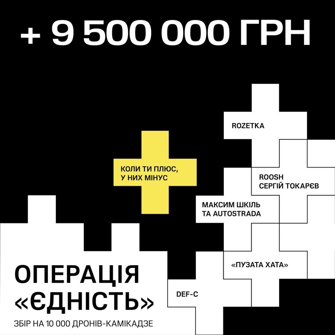UNITED24, “Повернись живим” та monobank успішно провели операцію “Єдність” — збір з метою придбання 10 000 дронів-камікадзе для української армії. Цільова сума — 235 мільйонів гривень.