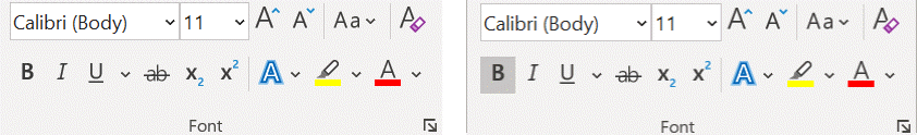 У Word піктограма «B» для напівжирного шрифту (ліворуч) набуває тіні, коли її вибрано (праворуч), щоб вказати, що ви перебуваєте в режимі напівжирного шрифту (не звичайного). У цій реалізації кнопка не змінює підпис, коли користувач натискає її.